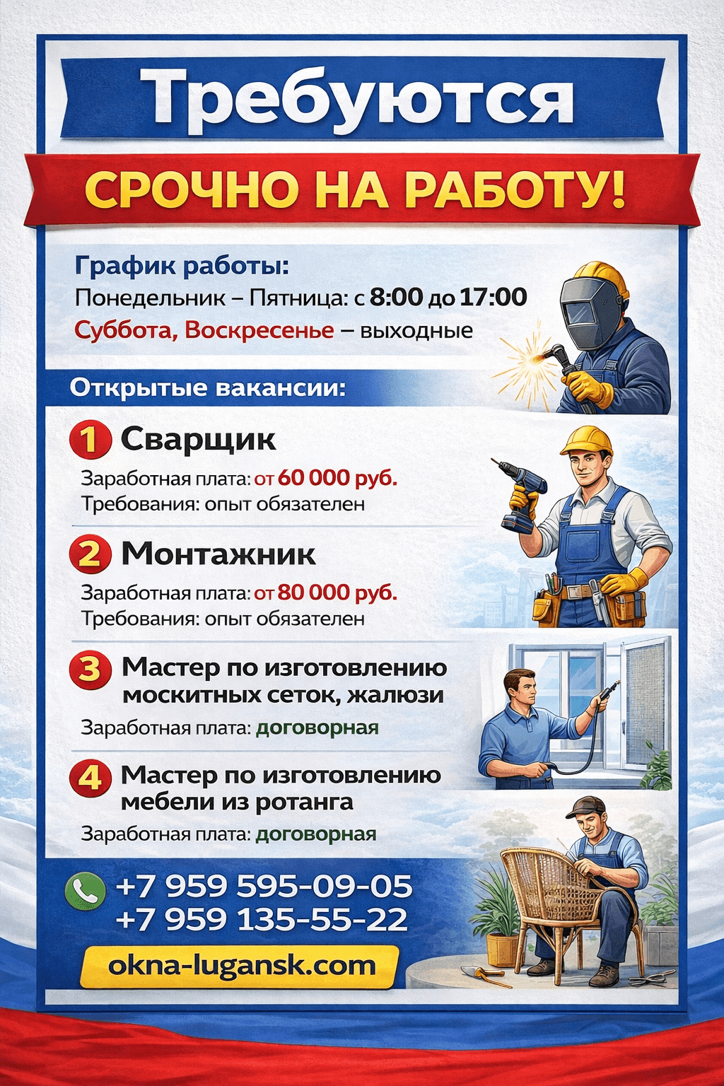 Заработная плата: от 60 000 рублей Опыт работы обязателен Суббота, Воскресенье - Выходной Рабочий день с 8:00 до 17:00