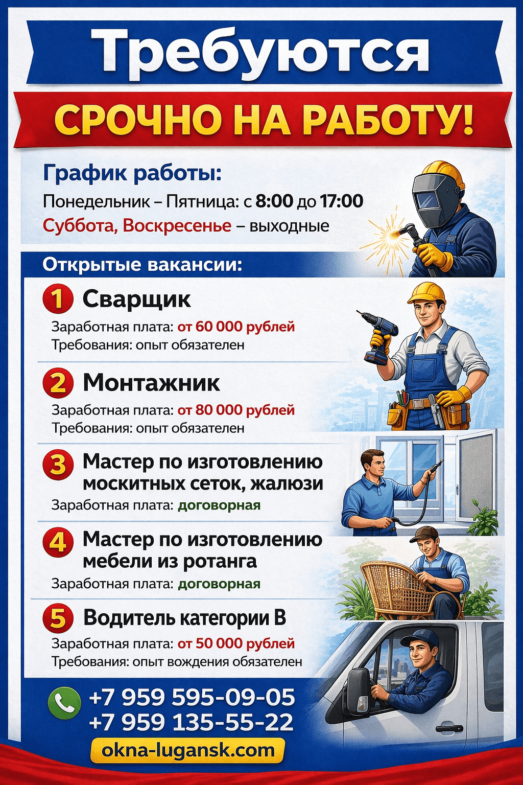 Заработная плата: от 80 000 рублей Опыт работы обязателен Суббота, Воскресенье - Выходной Рабочий день с 8:00 до 17:00